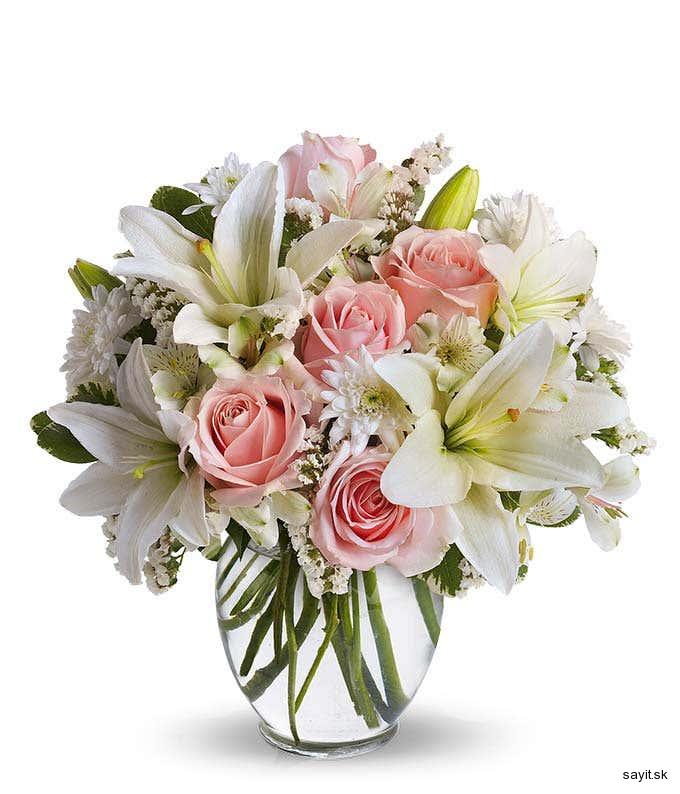Kytica z ružových ruží bielych ľalií a chryzantém