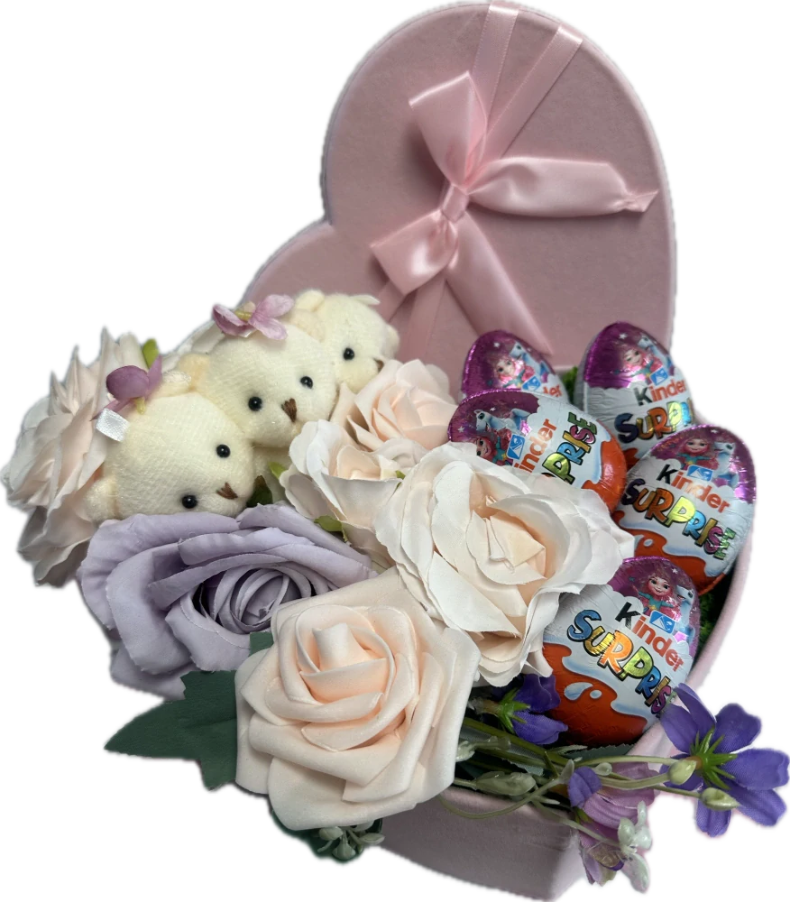 Kinder sladký box s medvedíkmi je rozkošný darček plný sladkého prekvapenia, ktorý poteší deti aj dospelých. Jemne ladený box obsahuje obľúbené čokoládky Kinder, roztomilých plyšových medvedíkov, dekoratívne kvety a elegantné doplnky, ktoré spolu vytvárajú harmonický a láskavý dar.