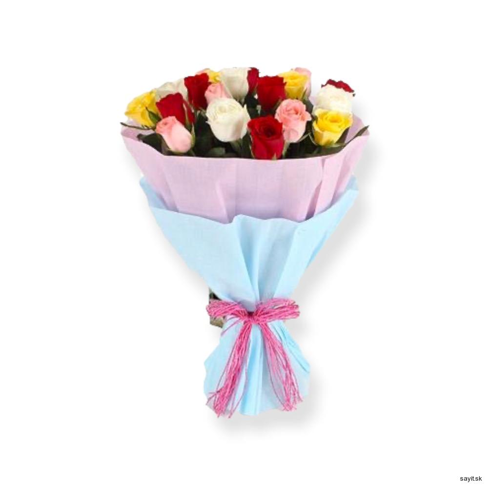 Každý kvet, každá kytica spolu s ich sfarbením má svoje vyžarovanie a je jedinenčná. Hovorí sa, že kvety sú najkrajším darom. Pohlaďte milovanej osobe zmysly. Presne to poskytuje táto unikátna pestrofarebná kytica zložená z ruží v teplejších odtieňoch ružovkastej, žltej, červenej a bielej farby. Kytica je zahalená v luxusnom pastelovom obale. Ak chcete priniesť Vašim blízkym trochu dúhy do bežného dňa, siahnite práve po tejto kytičke. Ruža každej farby je bežne považovaná za nadčasový symbol lásky, úcty, viery, krásy, rovnováhy, vášne, múdrosti, oddanosti, zmyselnosti.