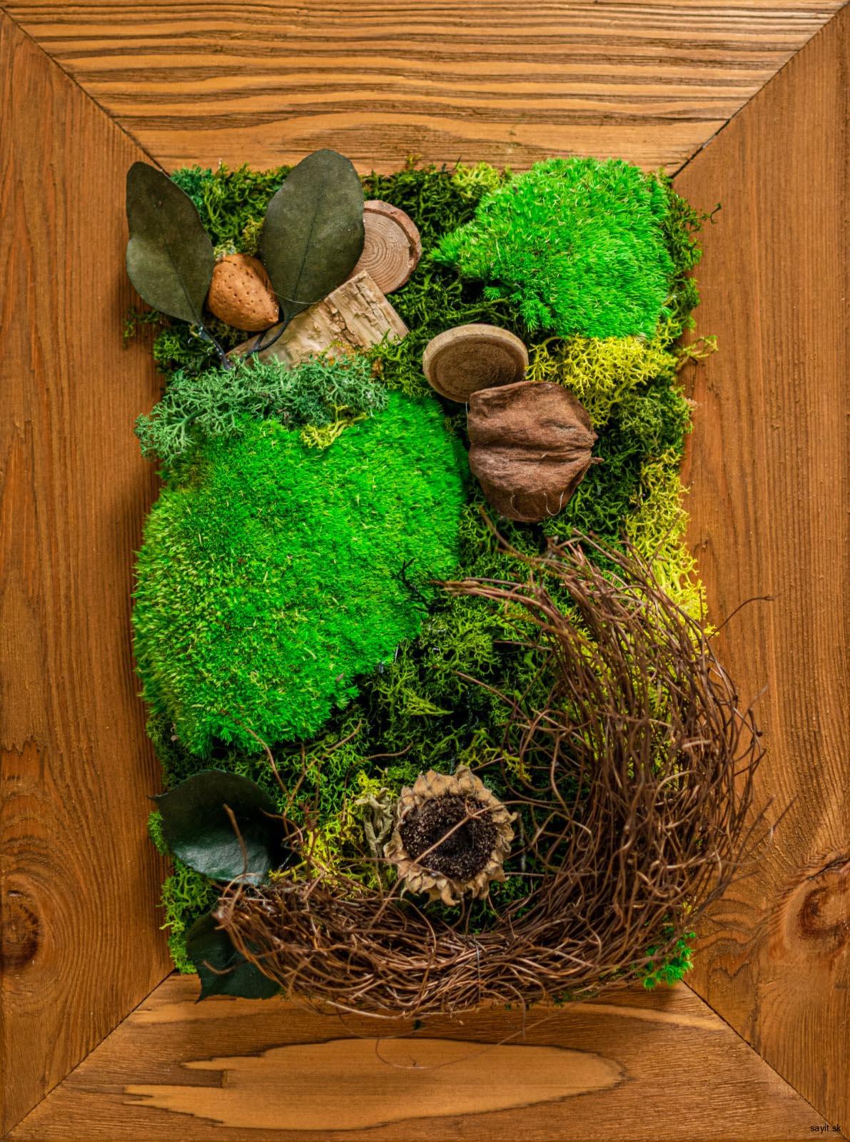 Machový obraz z tmavozeleného machu, svetlozeleného machu a kôry so stromu je jedinečným prírodným doplnkom do vášho interiéru.