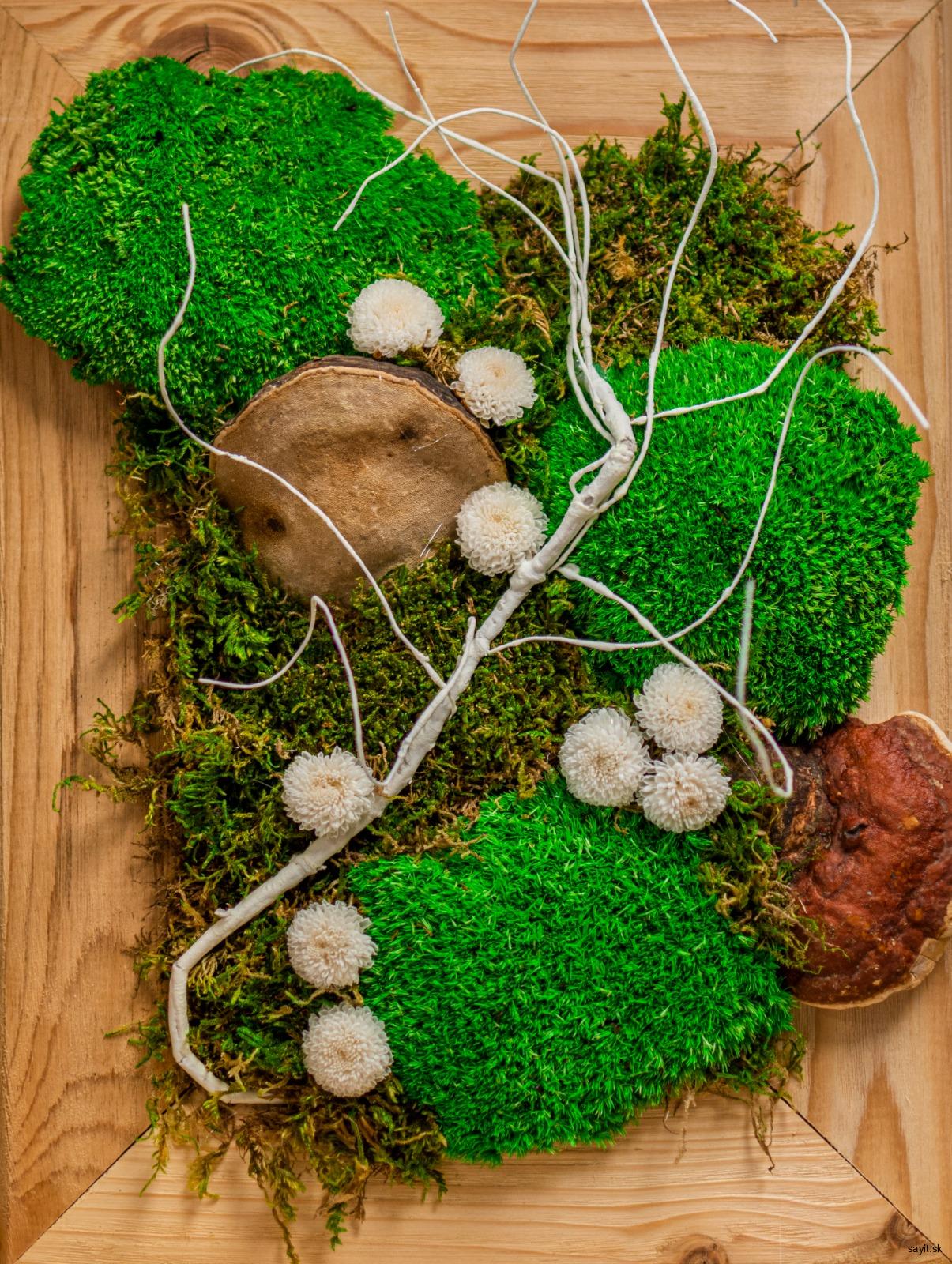 Machový obraz z tmavozeleného machu, svetlozeleného machu a kôry so stromu a stabilizovaných kvetov je jedinečným prírodným doplnkom do vášho interiéru.