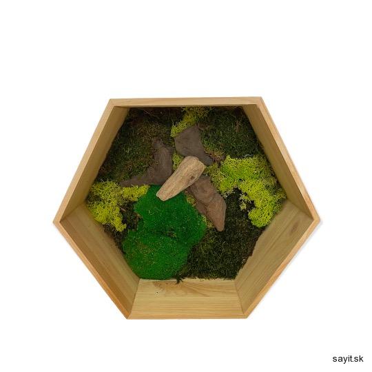 Masívny machový obraz v prírodnom šesťuholníkovom drevenom ráme.