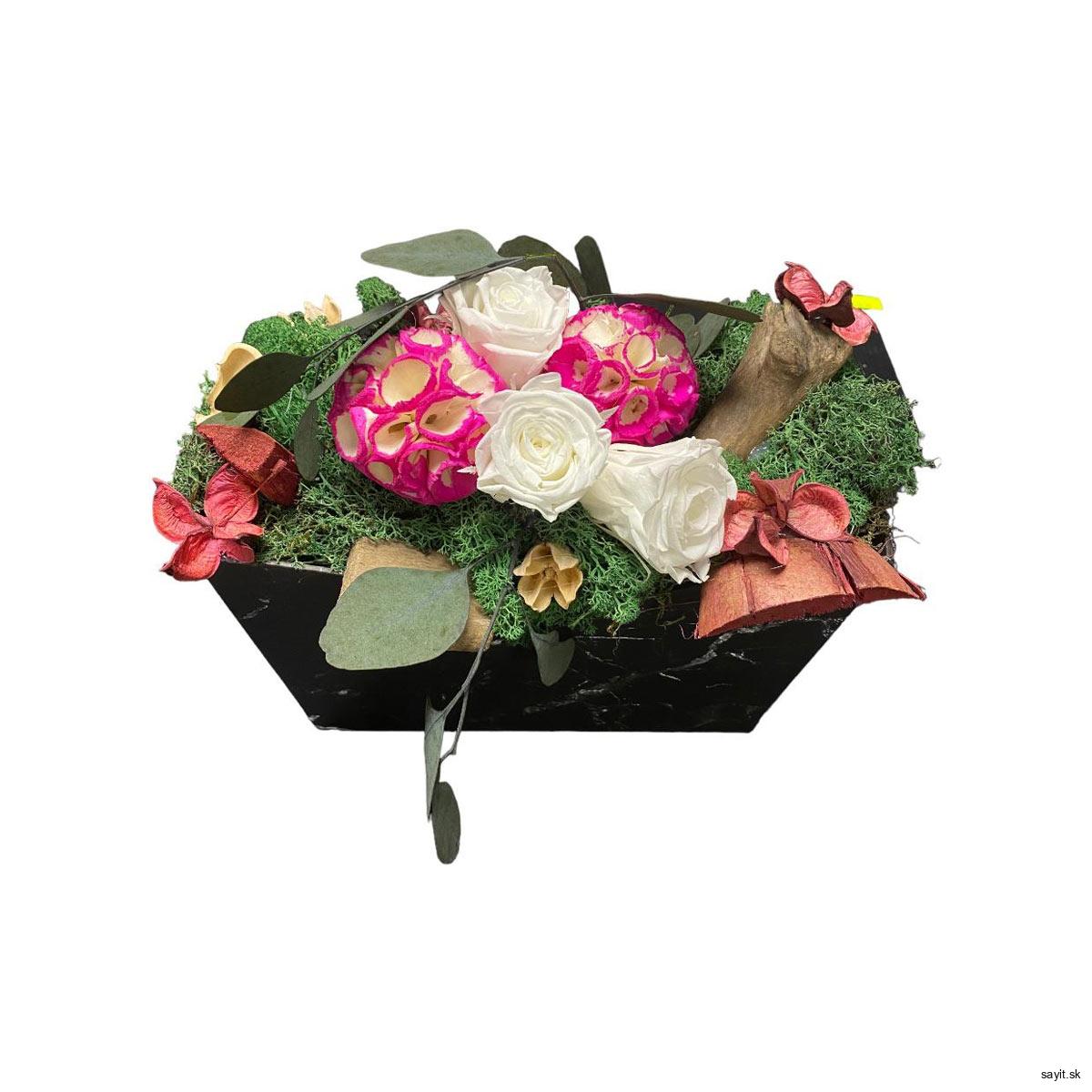 Prírodno-umelý aranžmán oživeným stabilizovaným machom a ohromujúcimi bielymi stabilizovanými ružami. Každý detail je starostlivo zladený, aby vytvoril dokonalú rovnováhu medzi prírodnou eleganciou a trvanlivosťou.
