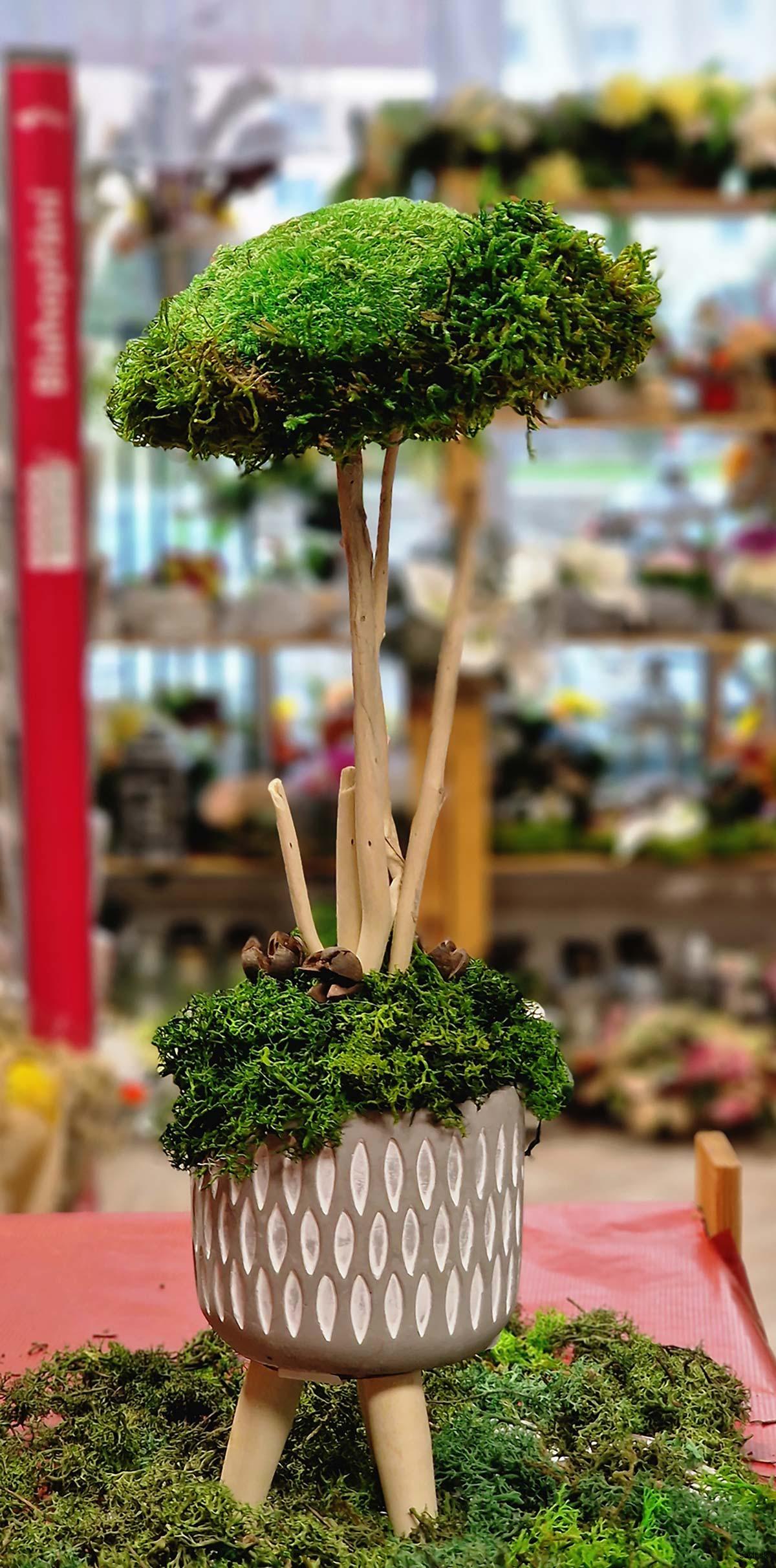 Aranžmán vo forme stromčeka so stabilizovaným machom a dreveným konárikom. Tento kúzelný prírodný dizajn prináša lesnú atmosféru do vášho interiéru. Stabilizovaný mach si uchováva živosť a čerstvosť, zatiaľ čo drevený konárik dotvára autentický vzhľad.