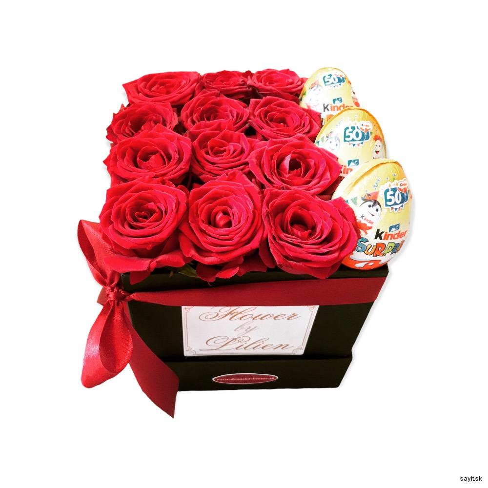 Originálný, kvetinový box plný čerstvých ruží, doplnený o vajíčka kinder surprise . Tento box nadchne milovníkov kvetov aj milovníkov chutnej čokolády. Kvety a sladké sa hodia na akúkoľvek príležitosť, preto týmto luxusným boxom nič nepokazíte.