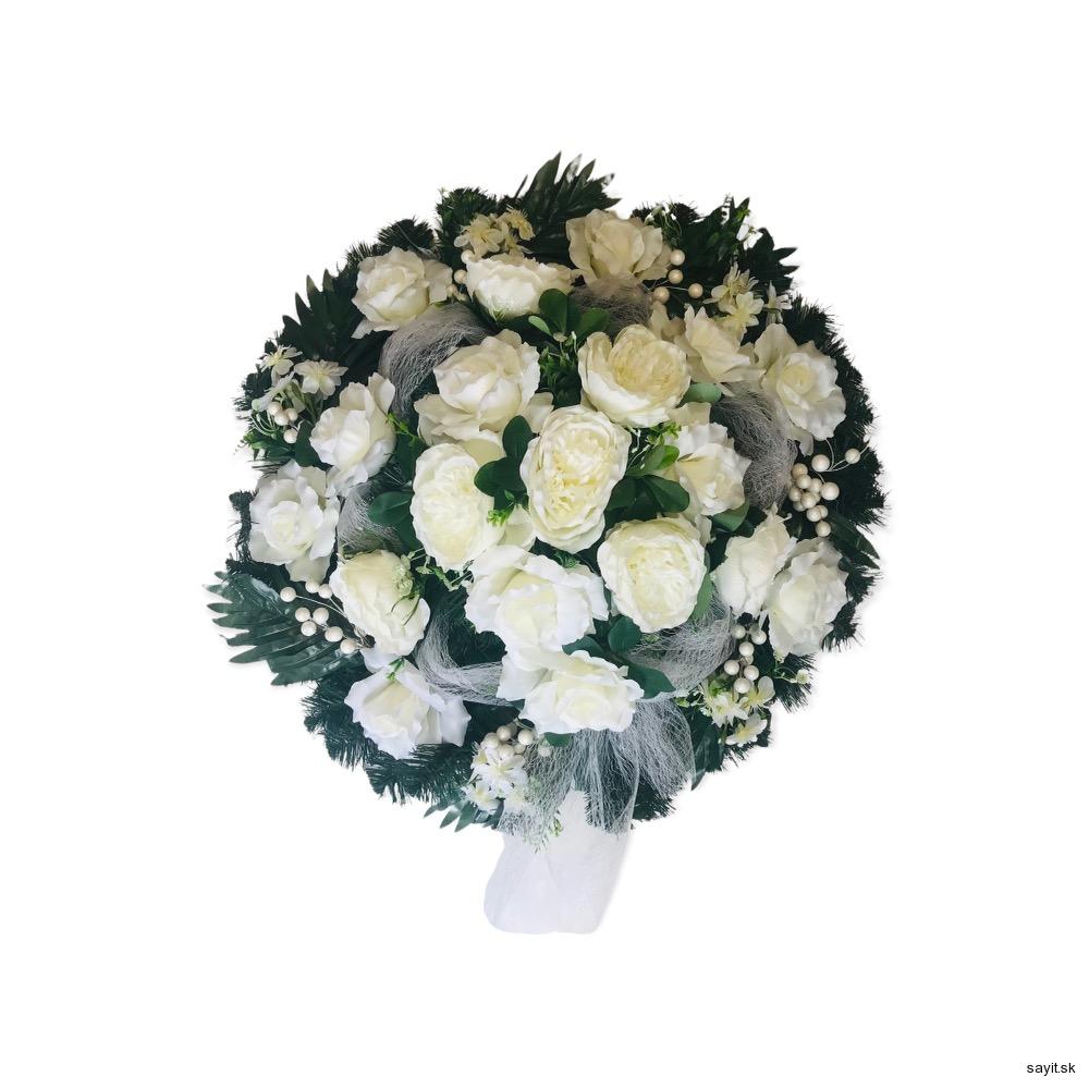 Umelý smútočný veniec okrúhly s priemerom 80cm. Do poznámky je potrebné uviesť text na stuhu.